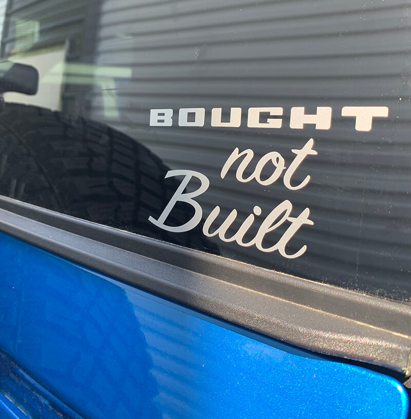 The Bought Not Built Die Cut decal measures 2.75 inches by 5 inches and features precise die-cutting for a clean finish. This decal is perfect for showcasing your passion for aftermarket parts and customization.