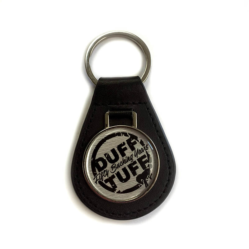 Introducing the Duff Tuff Leather Keychain, a premium accessory designed for those who appreciate quality and style. Crafted from weighted leather, this keychain features a sturdy construction and a sleek domed decal for a sophisticated touch.