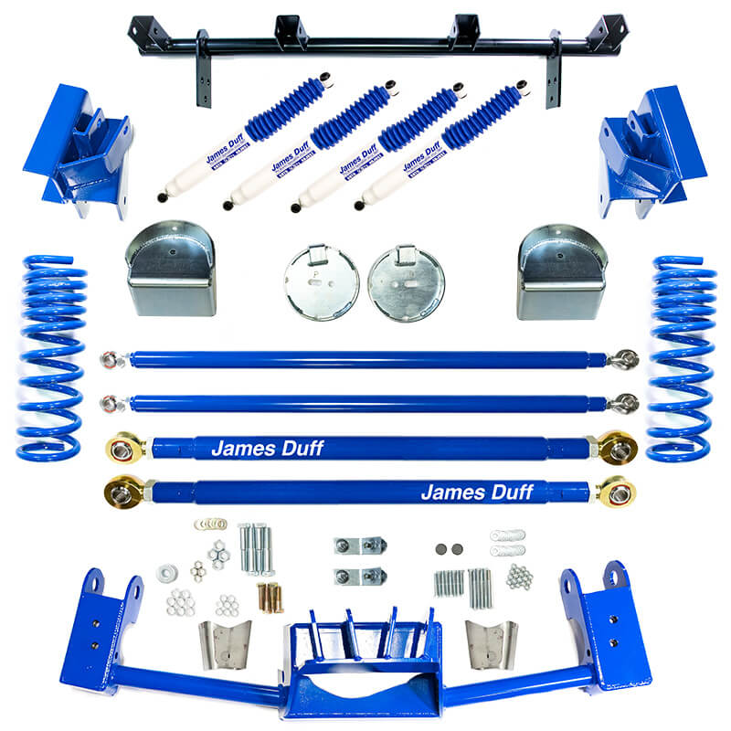 Transform your early Bronco’s performance with the James Duff Extreme 4 Link Suspension system. Designed for avid off-road enthusiasts, this premium suspension solution eliminates traditional leaf springs for an exceptional ride quality, improved traction, and reduced wear on drive components.