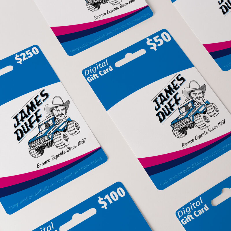 Introducing the James Duff Gift Card, the perfect present for the Bronco enthusiast in your life. This virtual gift certificate is delivered via email, allowing for instant gratification.