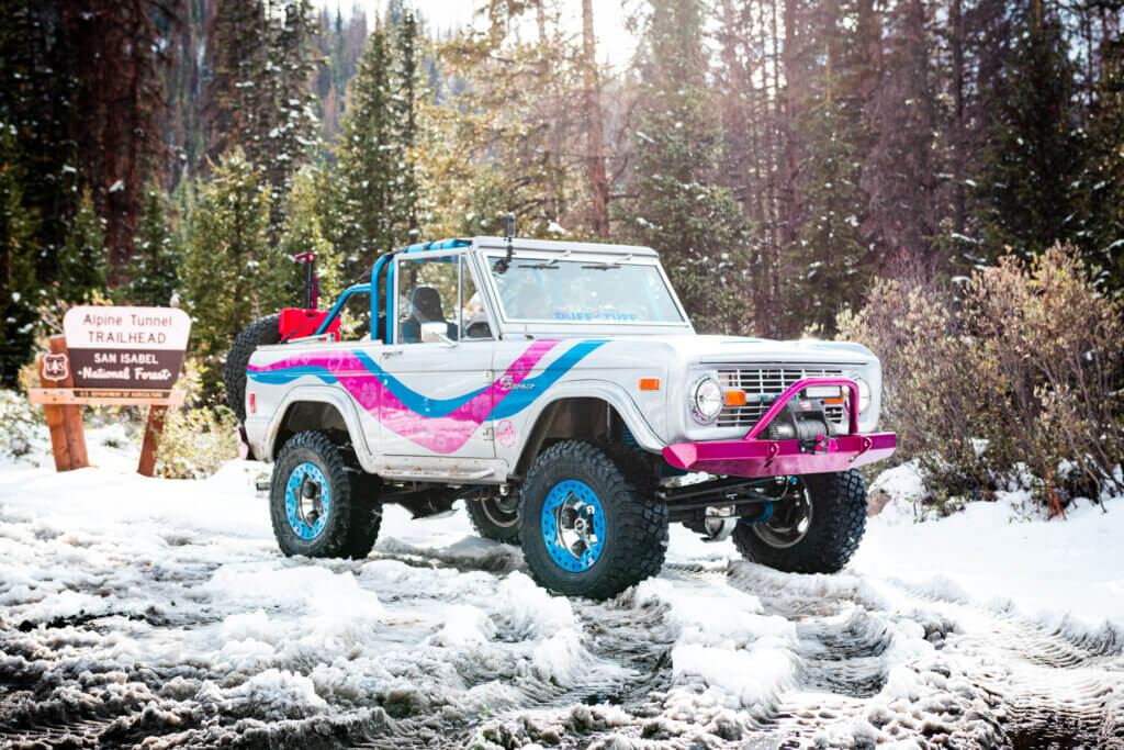 Hi Ho Silver or Silver is a 1977 Bronco, (recognizable as the only year with gas doors) It started its life as barely a driver that Mr. Duff bought in 1981 for $1800. It was stripped down over the years until 1991 when Richard Duff got the bug to build a Bronco of his own. There wasn’t much left of it at that point. He decided to make it a half cab and that’s why its roll cage is 2 parts. Silver sports a custom soft top and has been molded into Suzy's ride of choice when attending local street cruises or other Bronco events across the United States.